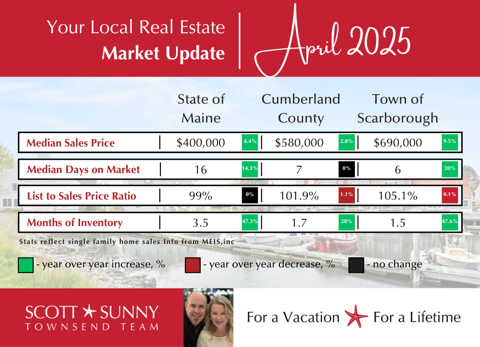 The provided graphic (from March 2025) offers a valuable snapshot of specific local market conditions, reflecting trends like Median Sales Price, Median Days on Market, List to Sales Price Ratio, and Months of Inventory for the State of Maine, Cumberland County, and the Town of Scarborough. These March figures illustrate the dynamics leading into April's activity.